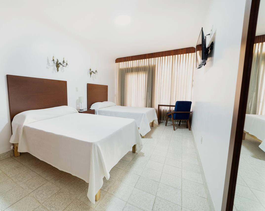 La habitación más amplia y elegante, cuenta con dos camas matrimoniales, smart tv, closet y baño privado.